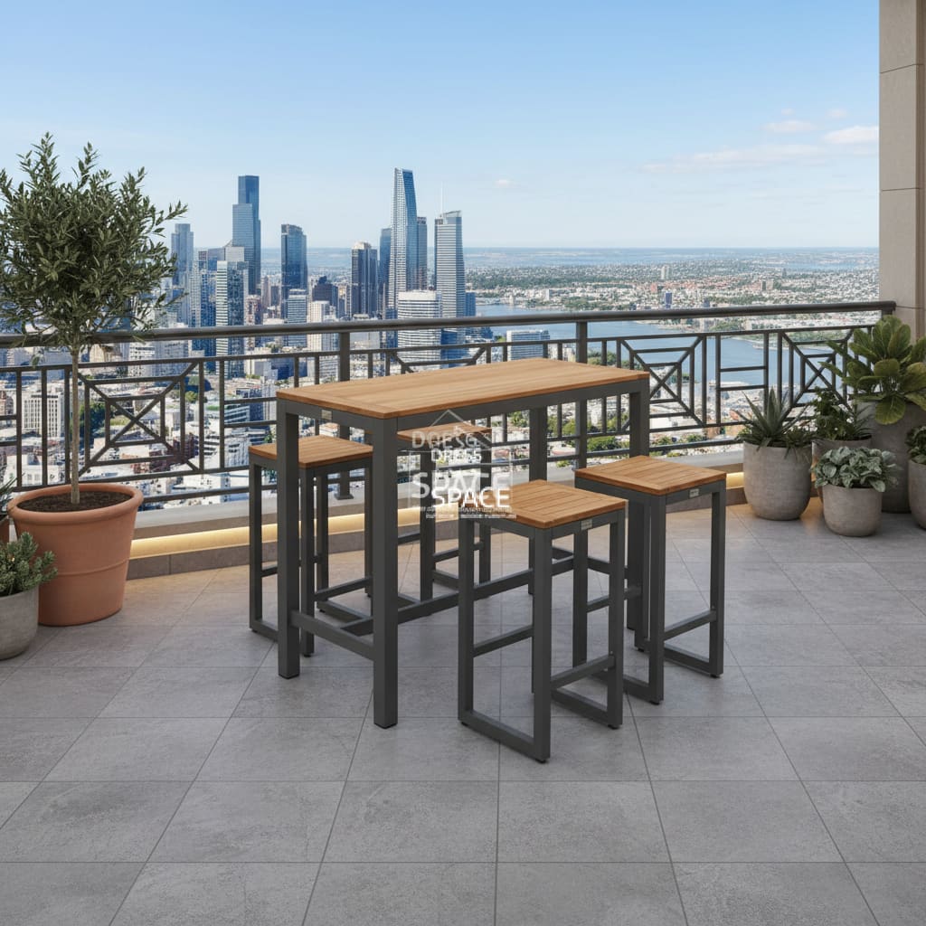 Imagine hosting sunset drinks on your balcony, the warm teak surface glowing in the evening light while you and your guests enjoy the comfort of this thoughtfully designed bar setting. The charcoal grey aluminium frame adds a contemporary edge that complements any outdoor décor style.