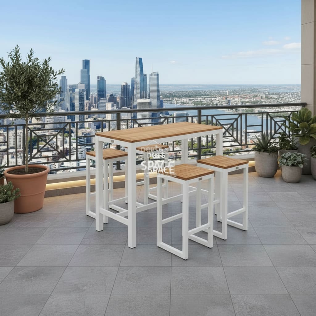 Elevate your balcony, patio, or outdoor entertaining area with the stunning Oslo 5 Piece Bar Setting in Shell White. This premium outdoor furniture set combines sophisticated Scandinavian design with exceptional durability, creating the perfect setting for alfresco dining and entertaining.