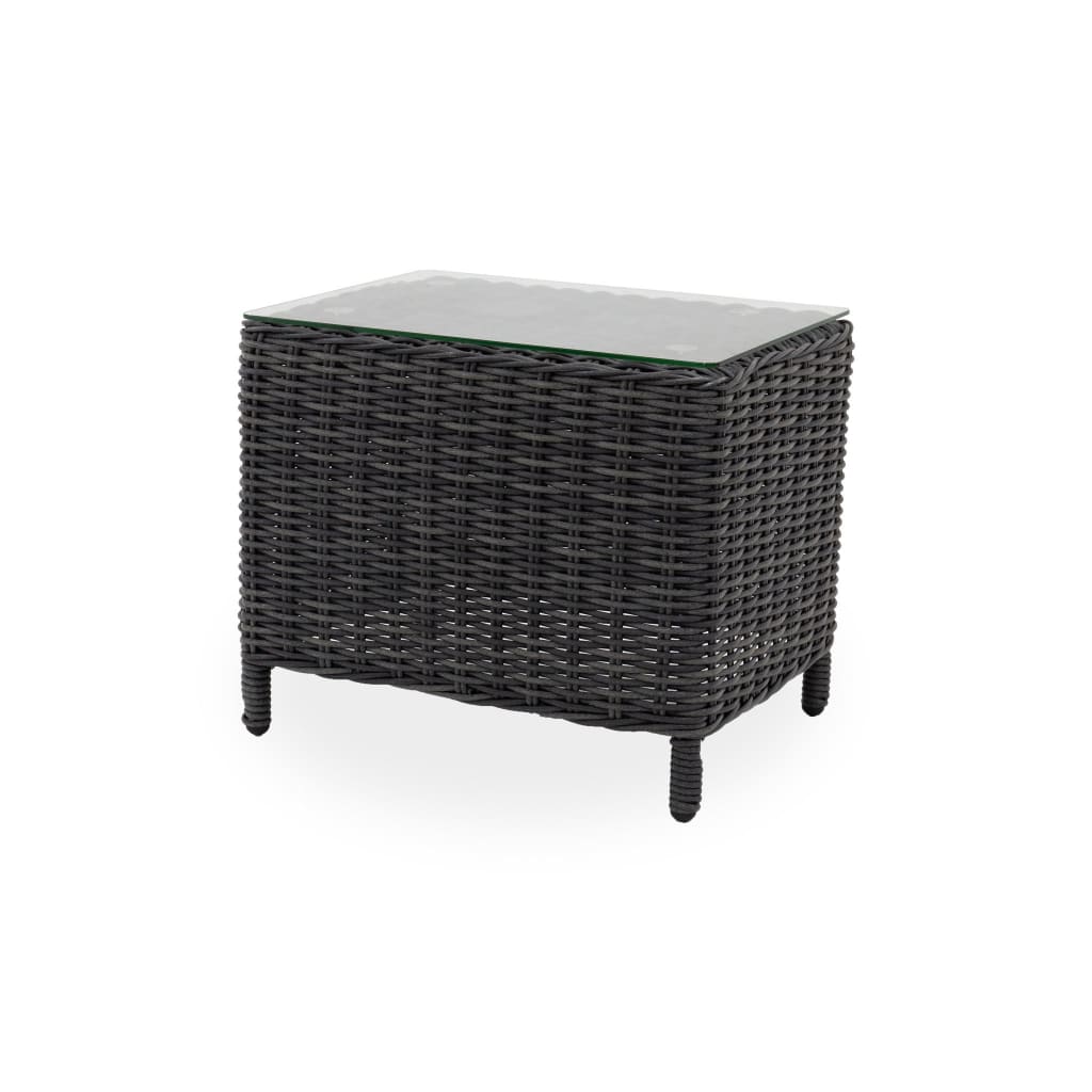 The Lisbon side table is constructed of a powder coated aluminium frame, HDPE wicker and tempered glass.