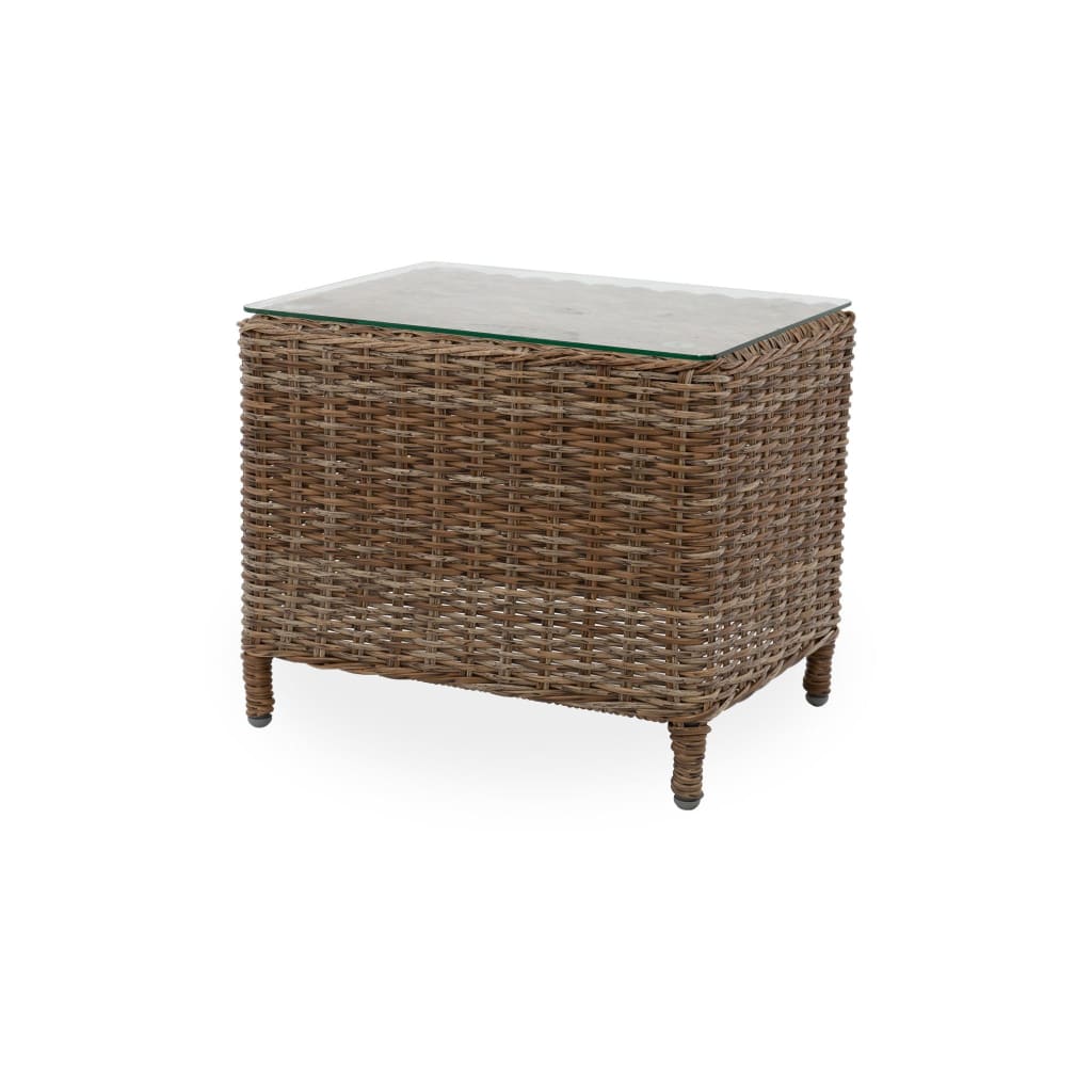 The Lisbon side table is constructed of a powder coated aluminium frame, HDPE wicker and tempered glass.