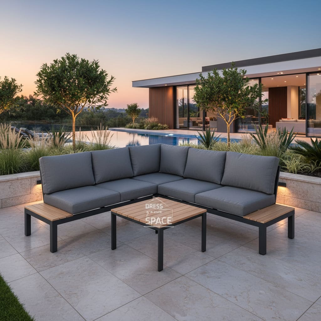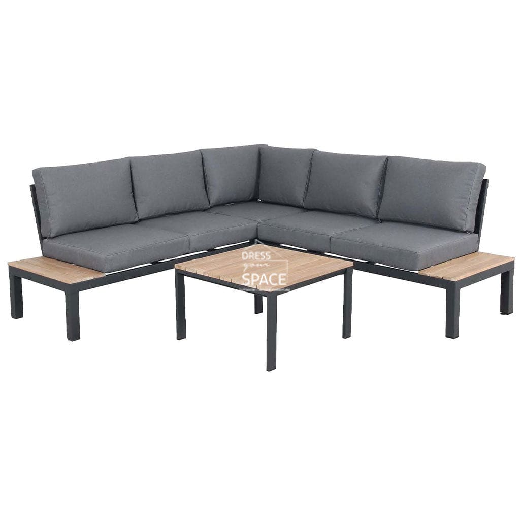 Modern Design: Charcoal frame with natural teak accents, corner configuration ideal for entertaining or relaxing