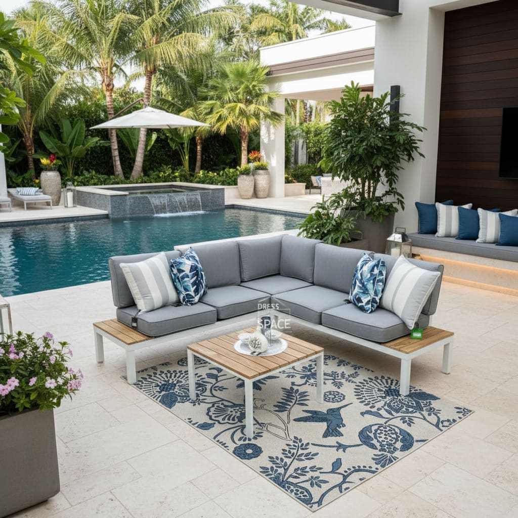 Stylish Design: Modern corner configuration with teak slats designed to naturally expand and contract