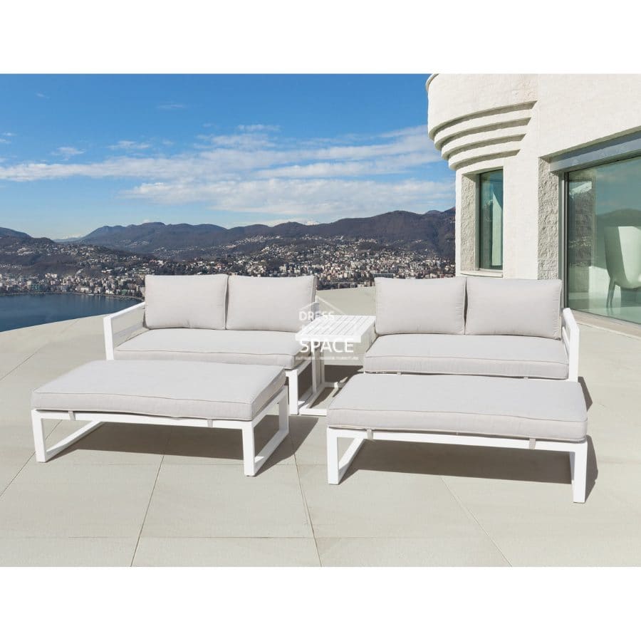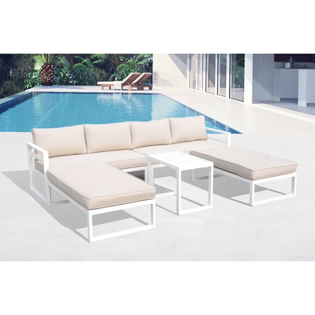 The Long Beach modular 5-piece outdoor sofa set offers contemporary and sophisticated outdoor furniture for your patio, garden and pool areas. The frame of the outdoor lounge chair or sofa is constructed from lightweight, rust-free aluminium and finished in a durable powder coating. The white aluminium outdoor sofa setting features back cushions and seat cushions covered in an Olefin fabric in modern Light Taupe. The cushions feature a quick drying inner foam, which makes them ideal for outdoor use. The Long Beach modular 5-piece outdoor loungers are highly configurable. The outdoor sofa set contains 2 ottomans and a coffee table that can be arranged to suit your outdoor space. The outdoor sofa from Dress Your Space is available to view in our Geelong showroom.