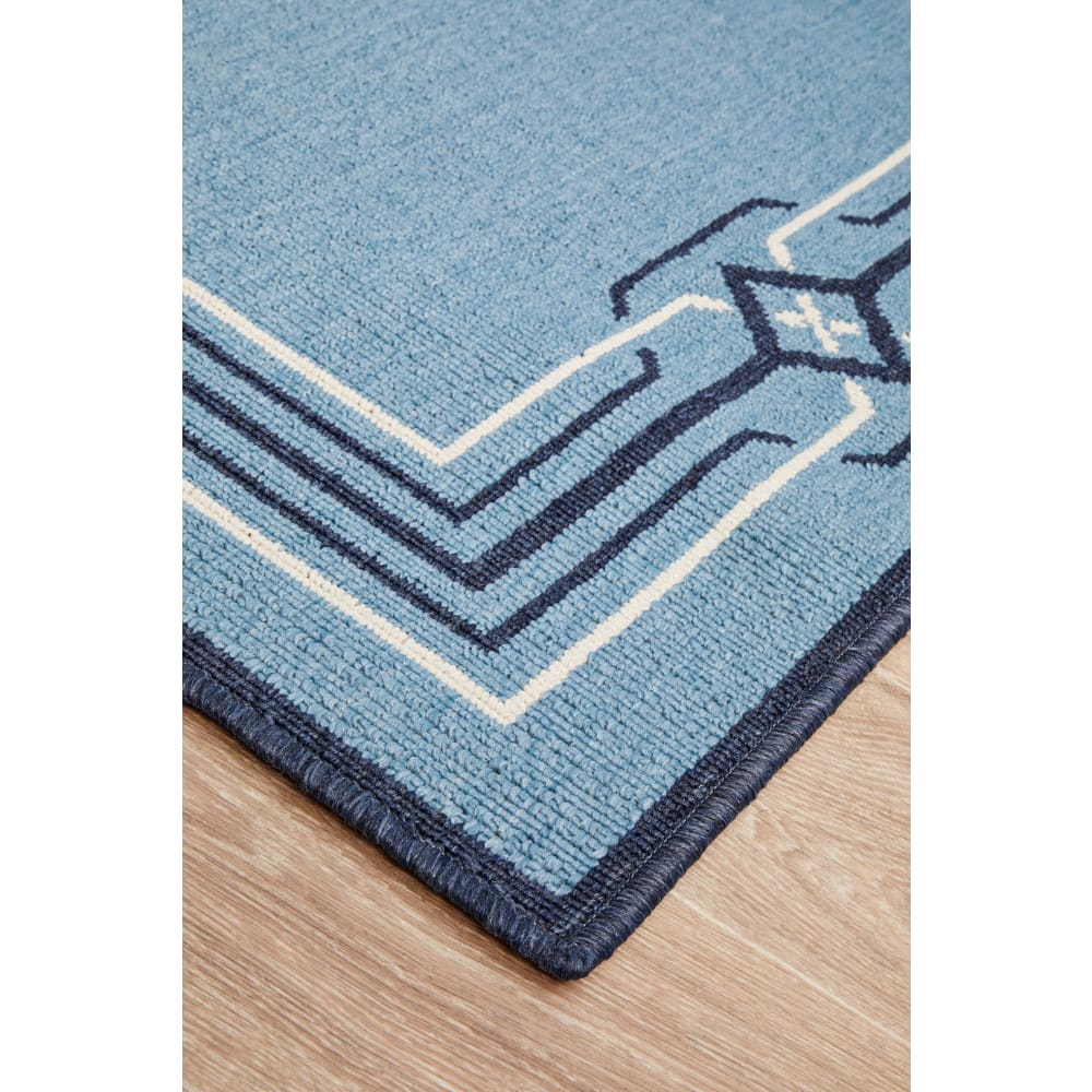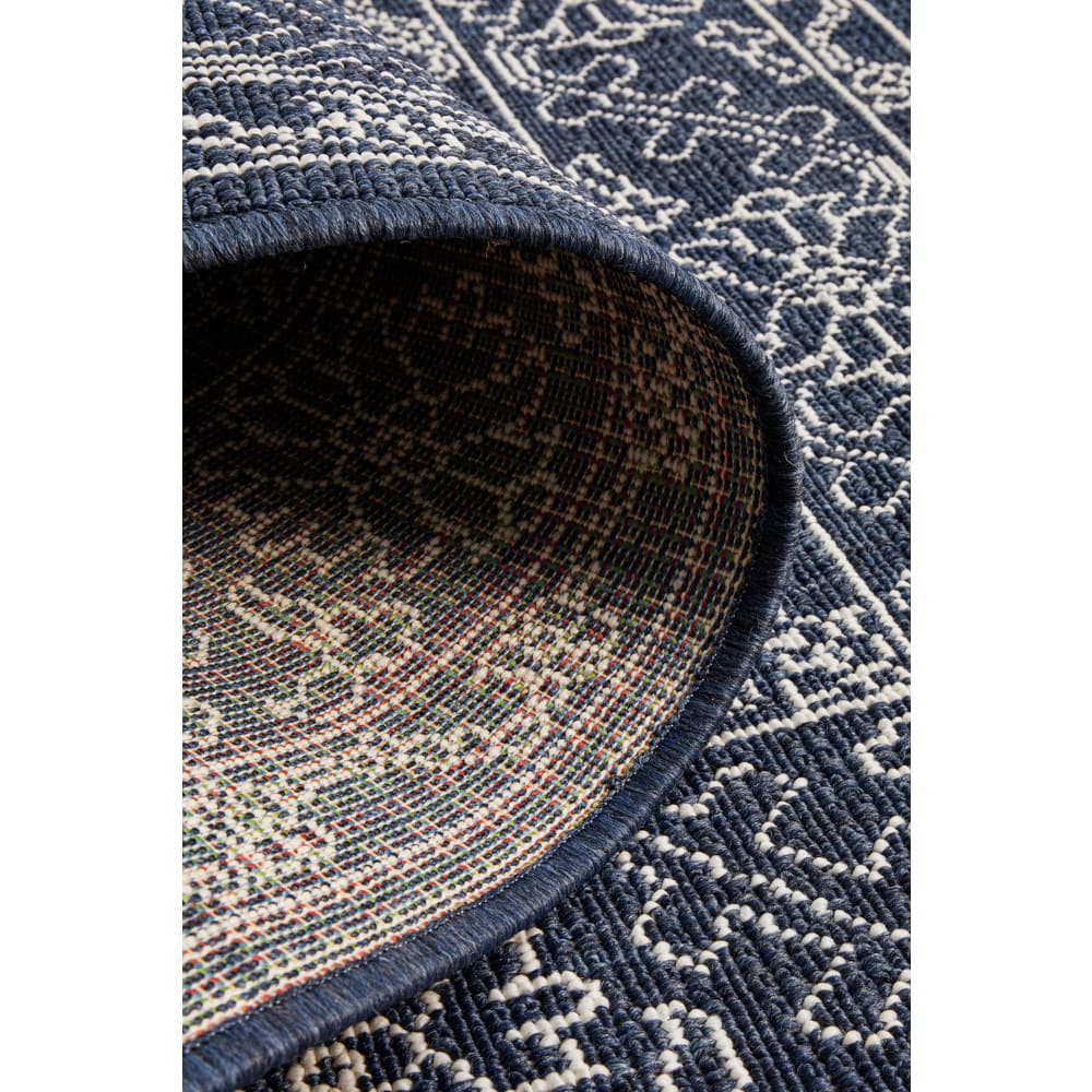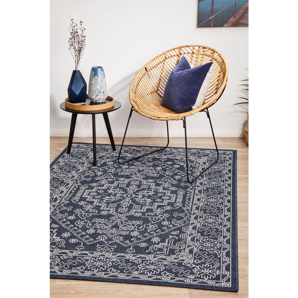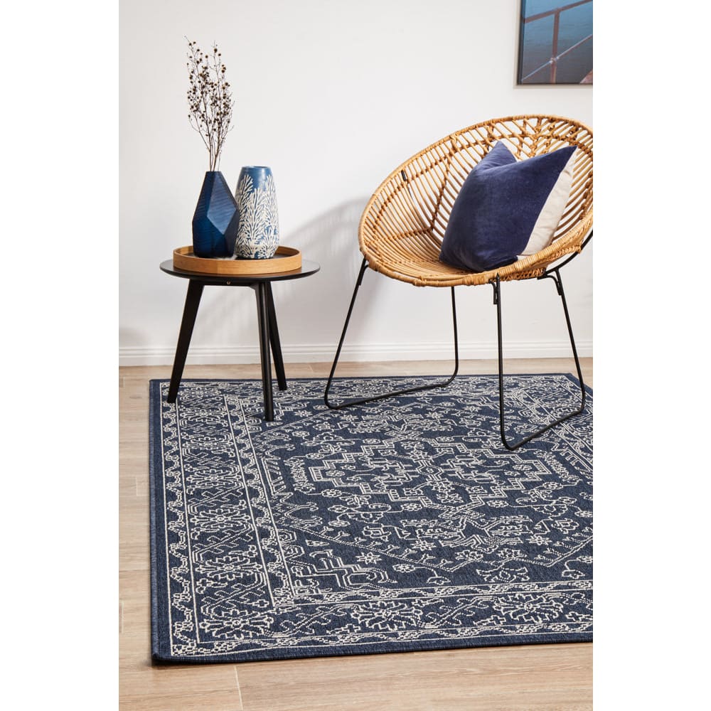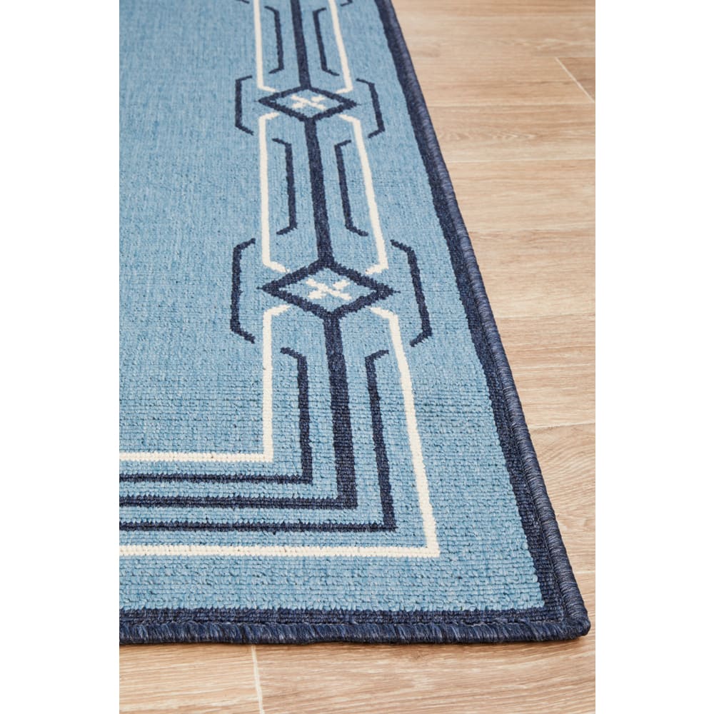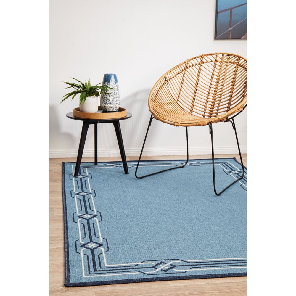 Adorned with a navy and white border, this simple but elegant design offers effortless style. This easy-care collection is designed to be used outdoors as well as indoors, these rugs are water resistant and will...