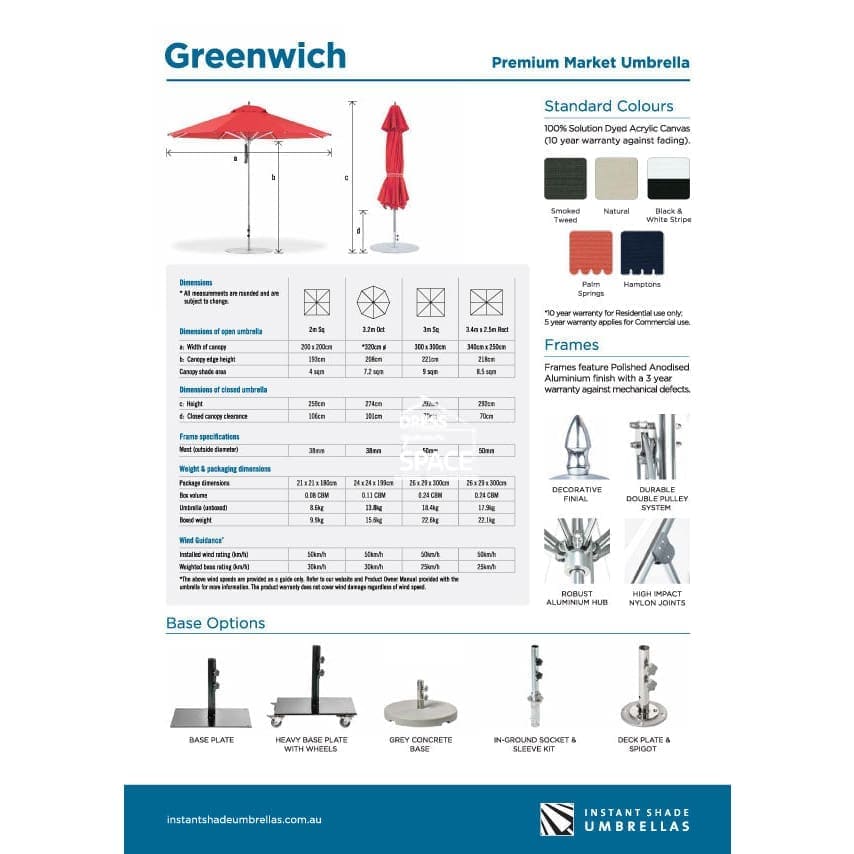 Constructed from marine-grade anodised aluminium, the Greenwich umbrella is ideal for coastal and high-exposure environments. With a wind rating of up to 60km/h, it is well suited to patios, balconies, dining areas, and footpaths in both residential and commercial settings.